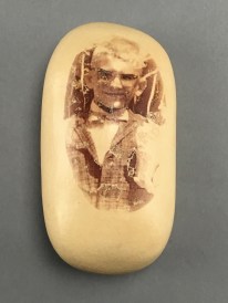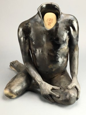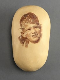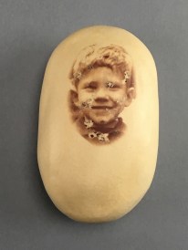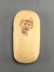 The images on the eggs are from childhood photographs, some happy, some anxious and some sad. Changing the egg changes the emotion that the figure is holding inside.